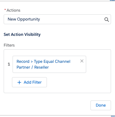 7. For this scenario I am going to create a filter for the New Opportunity button to only display when the Type= Channel/Partner Reseller