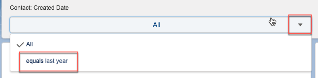 3. Search for the field you want to use as the filter – in my case, Contact Created Date. Then set the filter value based on your desired behavior, in my scenario, created in the last year.