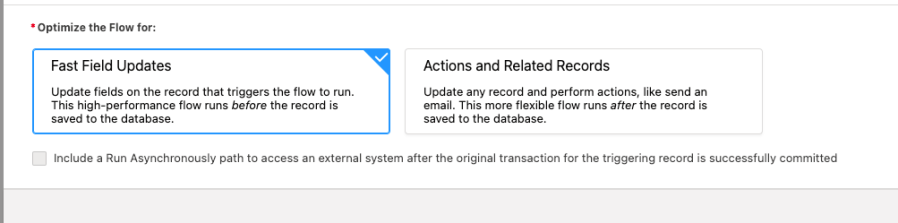 I started this flow back in Jan 2021, and at that time, I could not run Debug, and the options of selecting Fast Field Updates or Actions and Related Records did not exist. So I had essentially given up.