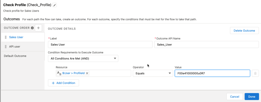 I originally had it set up to look at the owner’s profile while also having it set a Before Trigger, now called Fast Field Updates. While conceptually that was in line with my requirements, it does not work with a Before action since the owner field isn’t set yet or saved (hence it being BEFORE). So to make this flow work, I instead needed to use the profile of the User that was firing the creation of the contact object – this you have access to during a Before process.