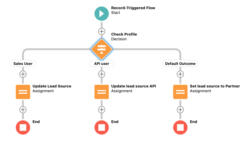 Alternatively, I could have done this with an After Trigger, otherwise called Actions and Related Records. However, doing so would have required an extra node, which would be an Update Record node, after the record was created. In this case, this would have been unnecessary, and the Fast Field Updates is the better choice.