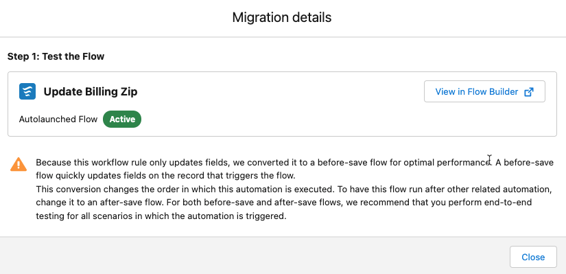 4. Click Switch Activations if you want to test it out, or go straight to the Flow Builder to run a debug test; Note that at the bottom, it gives you some information about the conversion that happened, including a decision about the before/after timing of the flow.