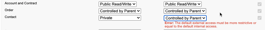 Contacts can be set to Controlled by Parent (Account), Public Read Only, Public Read/Write, and Private.
