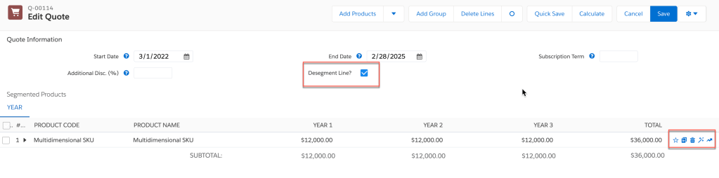 When you have MDQ products set up in CPQ, you automatically get the Wand icon which you can use to segment or desegment the products. Out-of-the-box, these icons are visible and easily clickable.