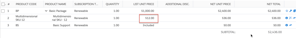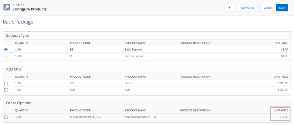 2. Create a quote with the product; you will see that the Option has the Unit Price from the previous step: