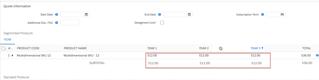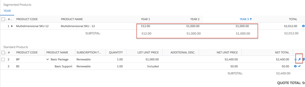 Suppose that you de-segment a product option and then resegment it. The first year’s segment applies the product option unit price. However, the remaining segments apply the price book price. To apply the unit price to the remaining segments, navigate to the parent bundle, click Reconfigure, and save. (Product option unit price is dependent on the SBQQ__Bundle__c field set to True. Clicking Reconfigure sets SBQQ__Bundle__c to True.) All segments then apply the product option unit price. [SOURCE]