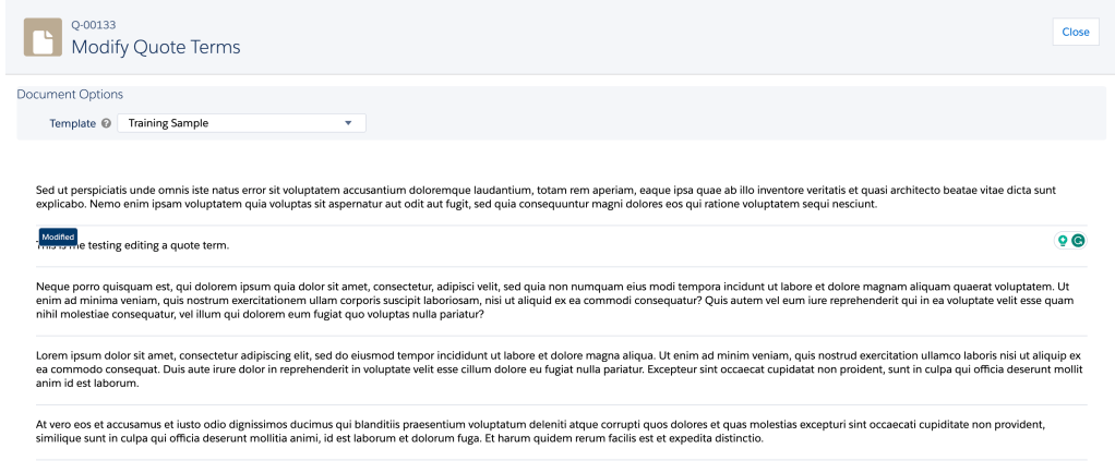 It’s also worth noting that while the Modified tag provides visibility of changes, it’s essential to exercise diligence by comparing the original and modified terms to fully comprehend the extent of the modifications. Although Salesforce currently lacks a built-in feature for side-by-side comparison, the clarity provided by the Modified tag combined with the updated Quote Terms related list helps effectively track and manage alterations.