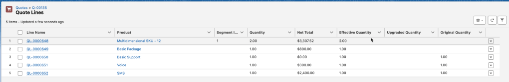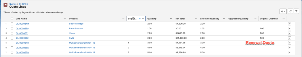 After making some modifications here, both on the segmented and non-segmented products, you can see a couple of things. First, the Original Quantity is only populated on the non-segmented products; this is just how Salesforce does things. However, this value allows you to compare Quantity or Effective Quantity to the Original Quantity (what the Renewal line came in as). You will also see that modifying the segmented product did not affect the Quantity or Effective Quantity behavior.