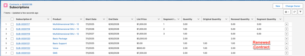 Once on the Contract record and looking at the Subscription records, you will start to see some differences. The Quantity field here only works essentially for the first Segment. To see the value of the second and third segments, you need to review the Segment Quantity field. The reason is that the segments are ramping, and CPQ treats the quantity field to show the delta between the previous and the current line you are looking at. Also, you will note that the Renewal Quantity field is populated; this shows the amount the line value will renew to at the end of the term.